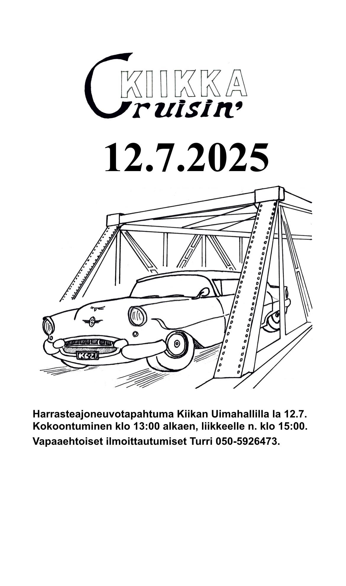 Harrasteajoneuvotapahtuma Kiikan uimahallilla. Kokoontuminen kello 13.00 lähtien, liikkeelle kello 15.00.